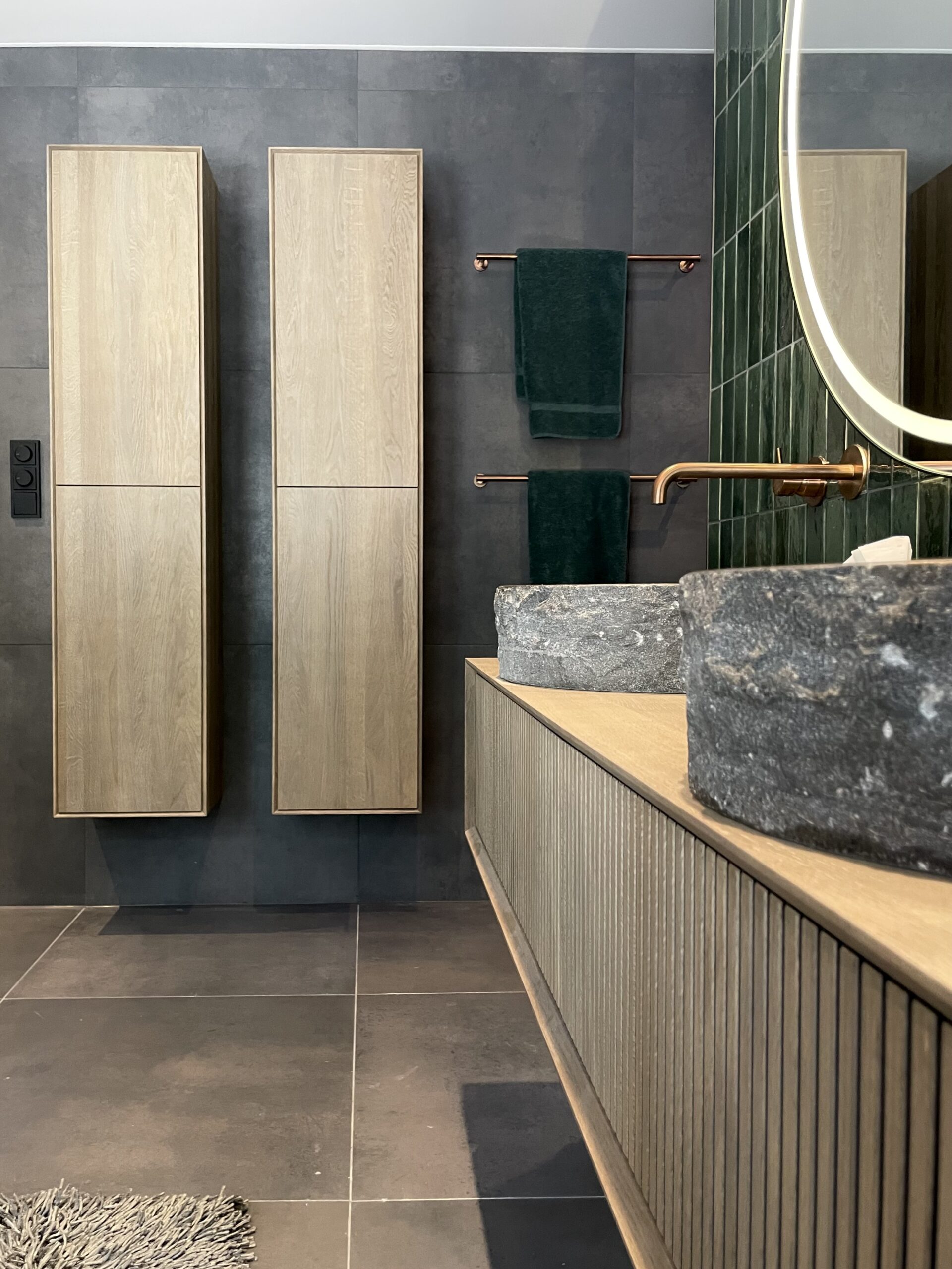 De renovatie omvatte het volledig vernieuwen van de vloer- en wandtegels. De gekozen 80×80 cm antracieten vloer- en wandtegel, in combinatie met langwerpige groene accenttegels, geven de badkamer een eigentijdse en chique uitstraling. De unieke keuze voor de groene, verticaal geplaatste tegels was gedurfd, maar het resultaat mag er zeker zijn!