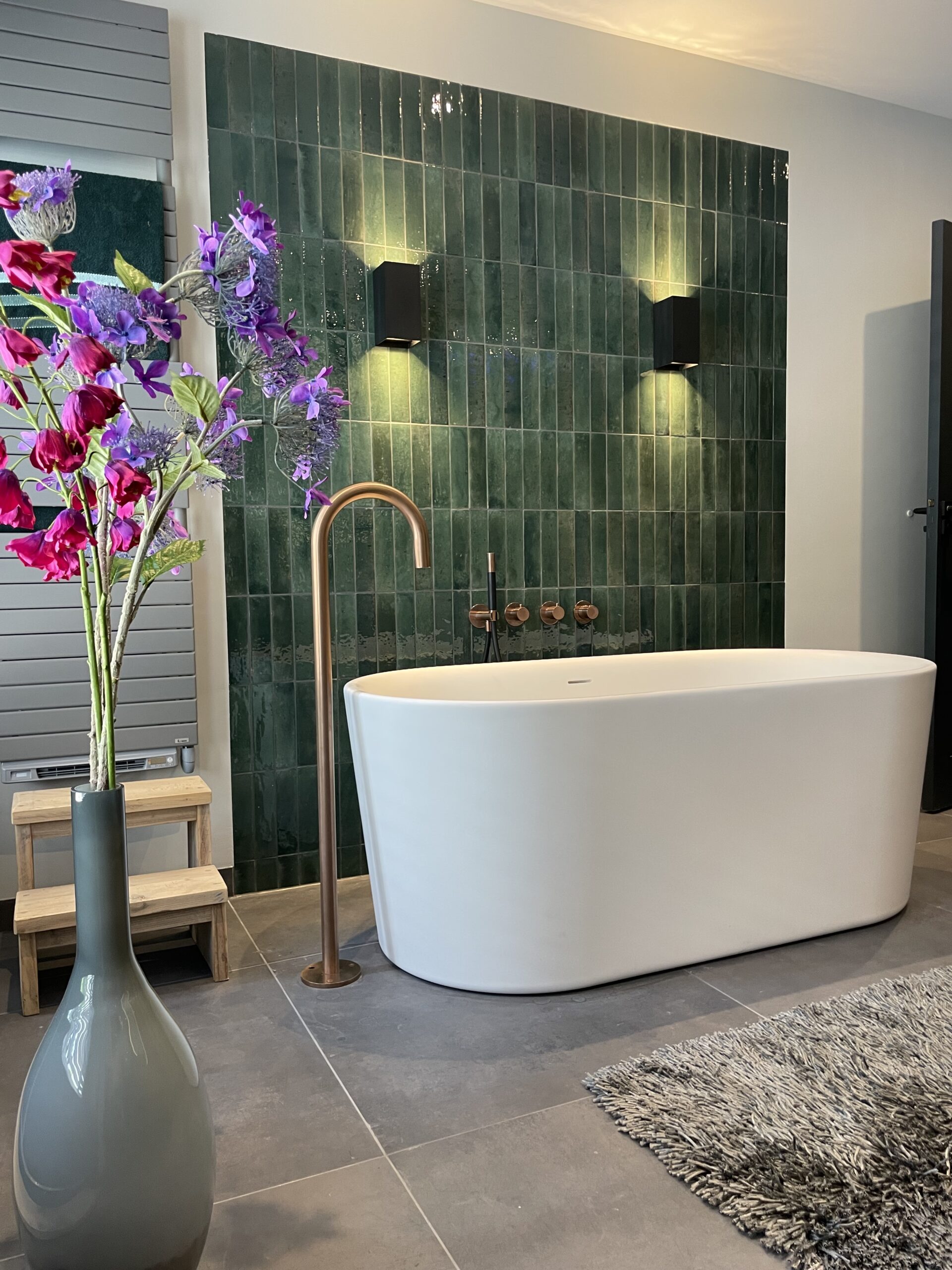 Een van de unieke elementen van deze badkamer is de combinatie van een vrijstaande baduitloop en stopkranen in de wand. Dit creëert niet alleen een eigenzinnige uitstraling, maar voegt ook een extra laag van luxe en functionaliteit toe aan de badkamer.