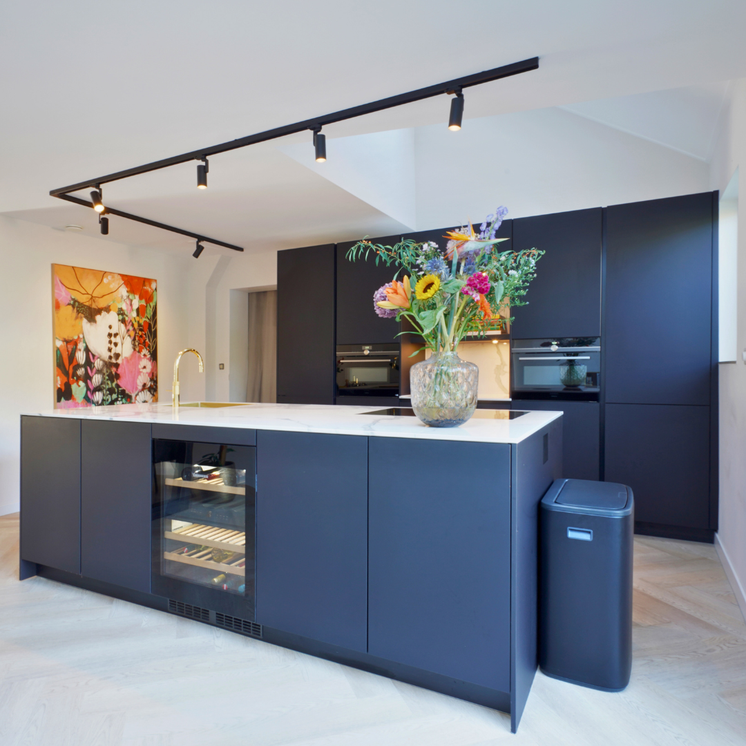 Wat deze keuken echt uniek maakt, is de toevoeging van een stijlvolle Liebherr wijnklimaatkast, ideaal voor wijnliefhebbers die hun collectie willen koesteren. Het keramiek blad geeft de keuken een tijdloze elegantie en maakt het plaatje compleet.