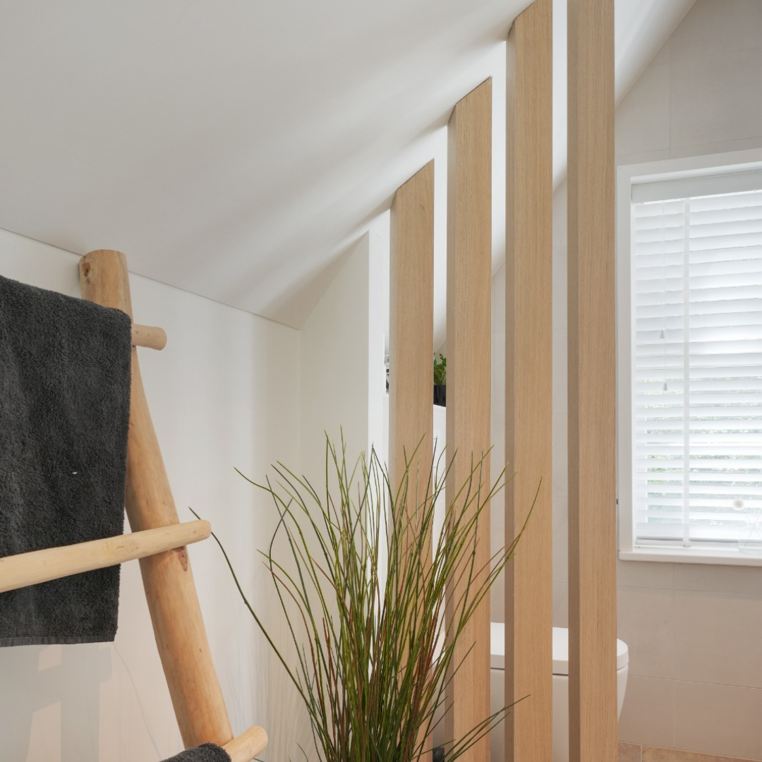De houten elementen brengen warmte en een natuurlijke sfeer in de ruimte. Door het hout op verschillende plekken te gebruiken, hebben we een mooi geheel gecreëerd dat tegelijkertijd modern en gezellig aanvoelt. De op maat gemaakte, half open douchecabine past perfect in het ontwerp en biedt net dat beetje extra. Het zorgt voor een open gevoel.