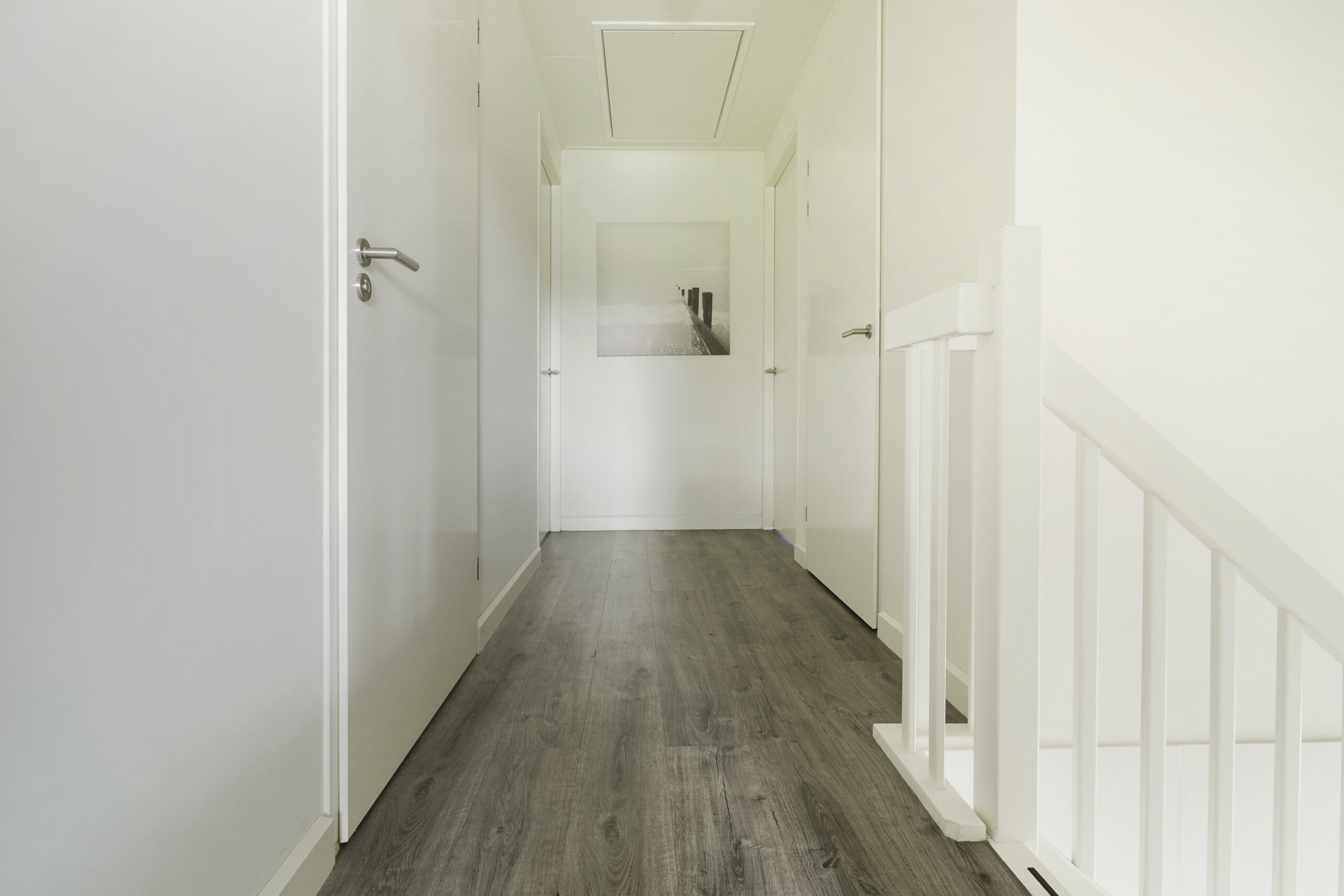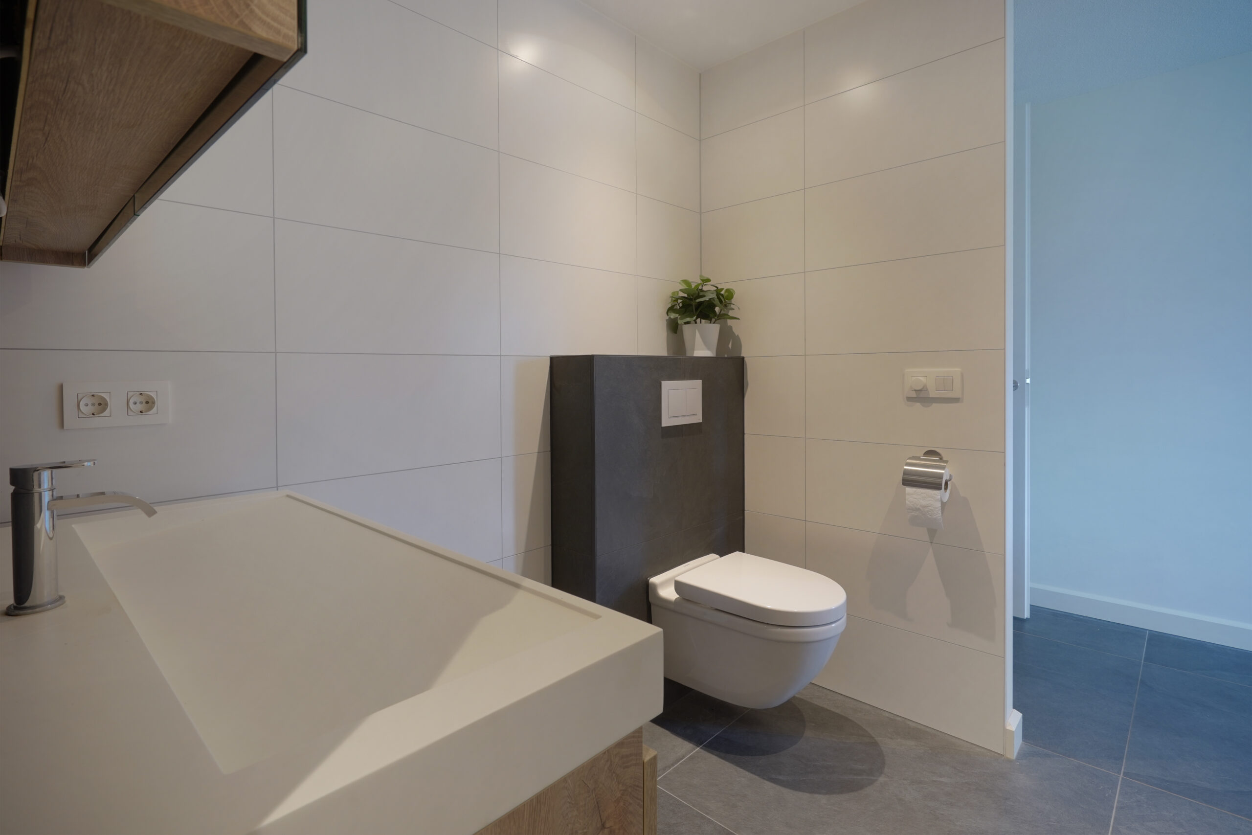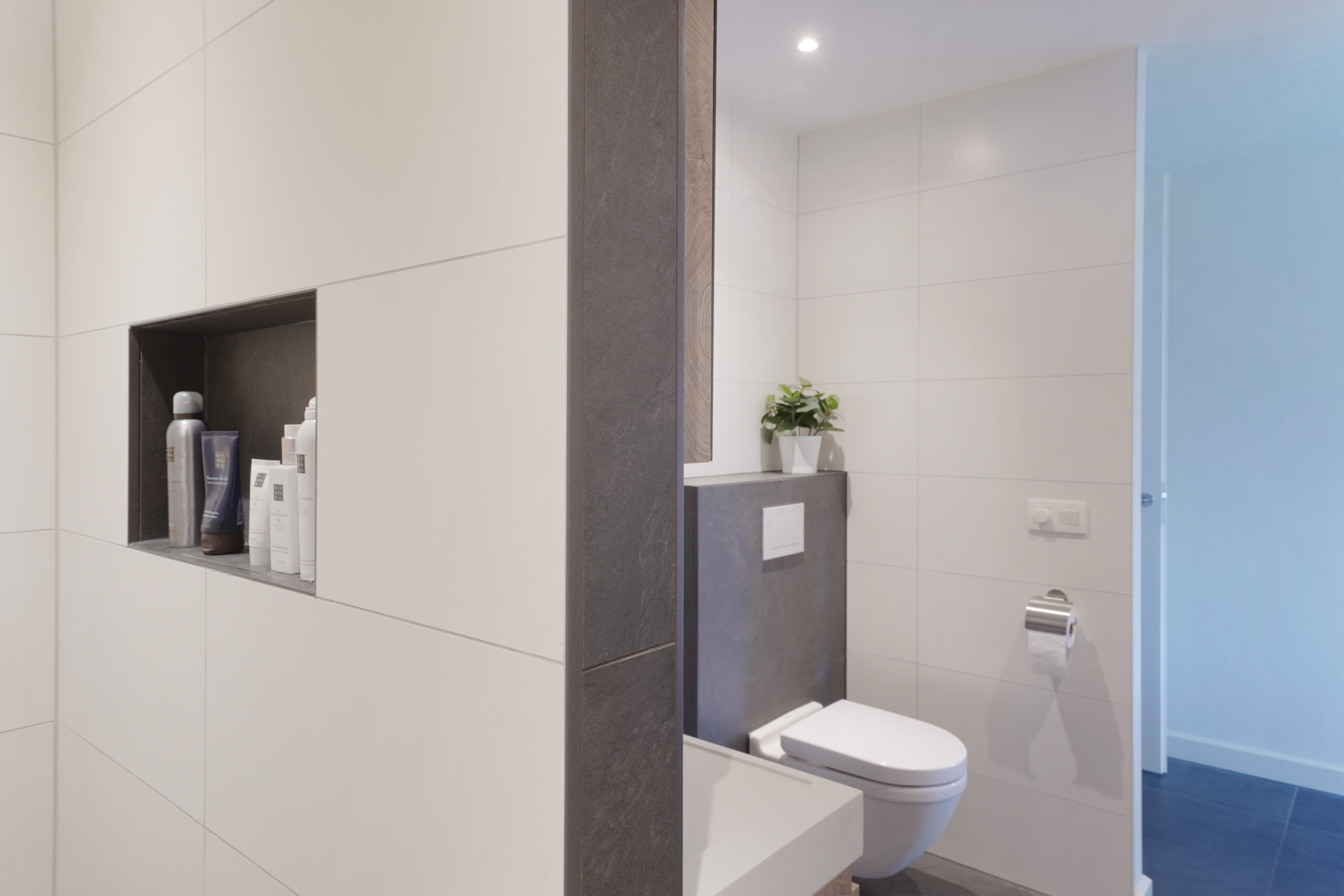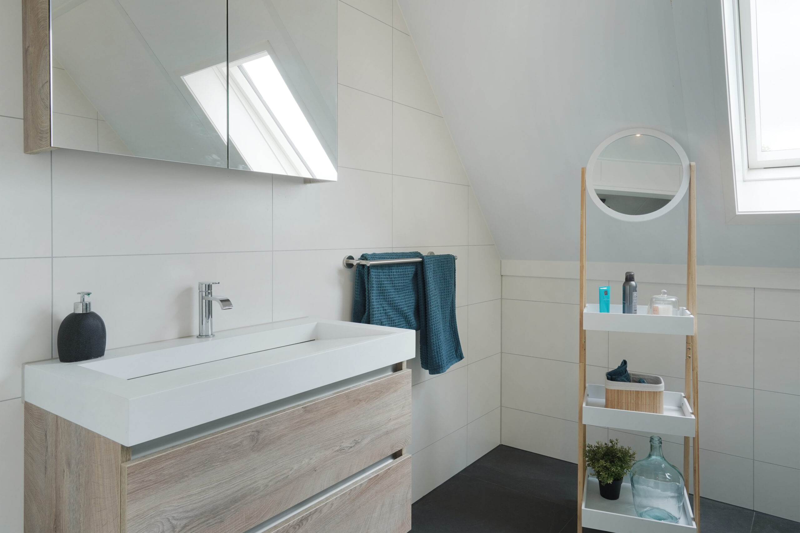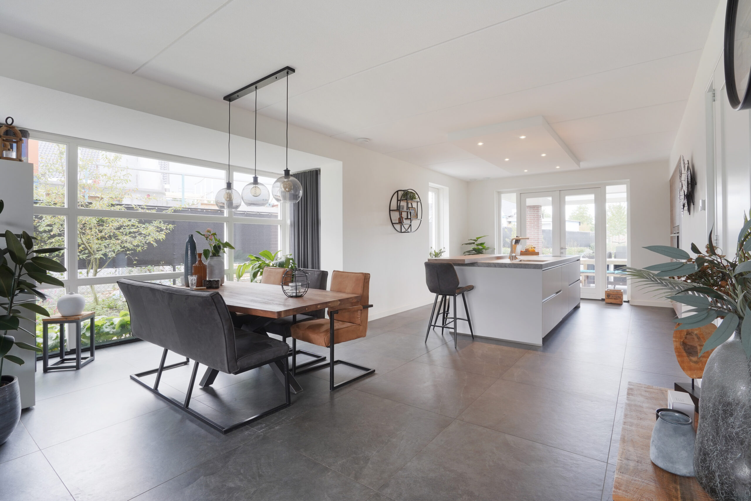 Naast de keuken die we geplaatst hebben, hebben we ook de vloeren en badkamer gedaan. In de stoere woonkeuken-en kamer is er voor een donkere tegel gekozen die mooi in contrast staan met de keuken en de lichte wanden. De tegel hebben we ook terug laten komen in de bad- en slaapkamer, zodat het een geheel wordt. Op de tweede verdieping is er gekozen voor een pvc vloer die in dezelfde stijl als de tegels is geplaatst.